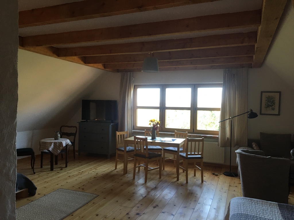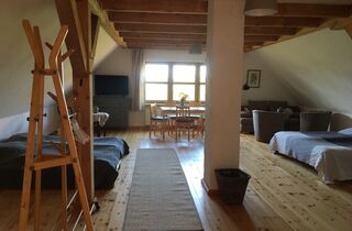 Schönes, helles sehr großes Appartement/Loft (70 qm) mit wunderschönem Blick in den Bauerngarten und in die Weite des Oderbruchs. Ausstattung mit viel Holz und liebevoller Einrichtung. Hier können maximal 3 Personen schöne Tage auf dem Hof verleben.